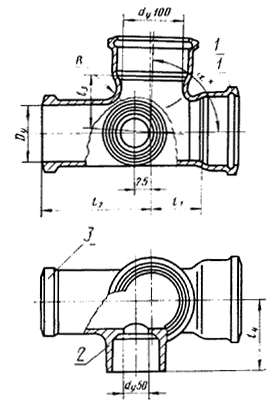 соответствовать указанным на чертеже и в таблице. * a = 87°30 или 90°, при этом размер 87°30 является предпочтительным, а в крестовинах высшей категории качества обязательным. 1 - раструб типа I по ГОСТ 6942.2-80; 2 - раструб типа III по ГОСТ 6942.2-80; 3 - хвостовик по ГОСТ 6942.2-80 Размеры в мм
