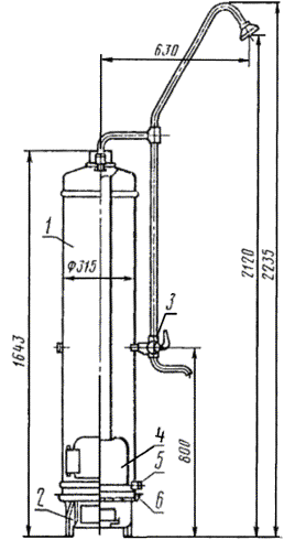 1 - водяной бак; 2 - подставка; 3 - смеситель; 4 - топка; 5 - сливной штуцер; 6 - заполнитель из смеси глины с асбестом Размеры для справок. Справочная масса не более 31,5 кг. Черт. 2 Таблица 2