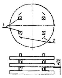 в один ряд; стеновые кольца - в два ряда по высоте в соответствии со схемой, приведенной на черт. 1; опорные кольца и плиты - не более чем в шесть рядов по высоте на прокладках (подкладках) в соответствии со схемой, приведенной на черт. 2. Схема складирования стеновых колец колодцев Схема складирования плит перекрытия и днищ