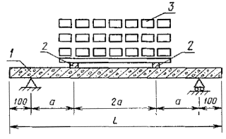 1 - испытуемая плита; 2 - деревянные брусья сечением 10´10 см; 3 - нагрузка на всю ширину плиты Черт. 4 Таблица 4