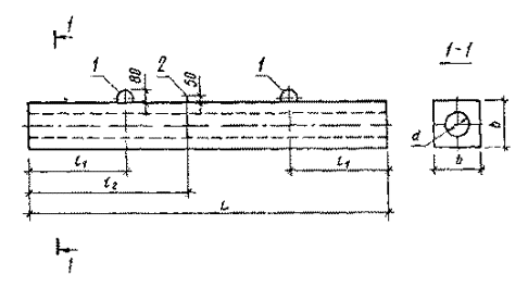 табл. 1. Сваи квадратного сечения с круглой полостью 1 - подъемные петли; 2 - штырь для фиксации места строповки