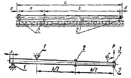 коэффициент 1,1. Схема испытания стоек 1 - неподвижные опоры; 2 - шарнирно-скользящие опоры; 3 - место закрепления тяги или троса; 4 - усилие натяжения при испытании Черт. 3 Примечания: 1. В шарнирно-скользящих опорах вместо катков могут быть установлены две стальные прокладки с промазкой солидолом слоем 2-3 мм. 2. Размер а определяют по рабочим чертежам опор. 3. Размеры c и d определяют по рабочим чертежам оснастки. 4.5.4. Испытание стоек на