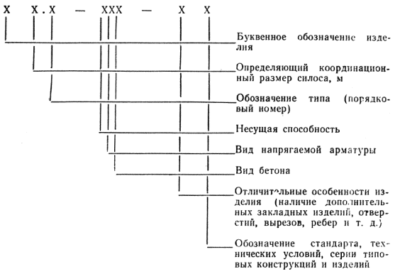 может дополняться цифрой, стоящей перед обозначением изделия: 2 - для укрупненных (спаренных) изделий квадратных силосов размером 3´3 м; 3, 4 и т.д. - для изделий круглых силосов (цифра указывает разрезку