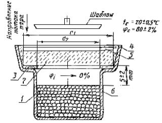 2.2.3. Испытуемую поверхность образцов, получаемых из строительной конструкции, оставляют без изменений. Поверхность образцов, получаемых из бетонных кубов или цилиндров, перед испытанием очищают от цементной пленки и шлифуют плоскопараллельно. 2.2.4. Испытание проводят на пяти образцах с защитным покрытием и на пяти образцах без покрытия. Поверхность образца обеспыливают. Нанесение защитного покрытия выполняют не ранее чем через 28 сут в соответствии с техническими требованиями для применения испытуемого покрытия. 2.2.5. Толщину образца измеряют в пяти точках с помощью штангенциркуля и определяют среднее арифметическое значение. Толщина образца с защитным покрытием включает в себя и толщину защитного покрытия. 2.2.6. По краю нижней поверхности образца приклеивают резиновое кольцо так, чтобы испытуемая поверхность без защитного покрытия не была запачкана клеем. 2.3. Аппаратура и материалы Для испытаний применяют: 1) стеклянные или металлические сосуды (черт. 1, табл. 2); 2) круглые шаблоны диаметром d2; 3) шкаф для кондиционирования (изменение температуры в пределах ± 2 °С); 4) резиновые кольца согласно диаметрам, приведенным в табл. 2; 1 - влагопоглощающее