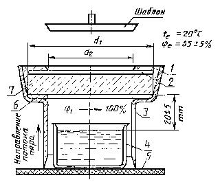 резиновое кольцо; 7 - образец 3.4. Проведение испытания 3.4.1. Подготовку бетонных образцов к испытанию проводят по п. 2.2.1 и 2.2.2. Образцы вставляют в расширенную часть обоймы и герметизирующей пастой, как указано в п. 2.4.1, заделывают зазоры между образцами и краями обоймы по черт. 3. 3.4.2. Для испытания паропроницаемости защитного покрытия, наносимого на стеклоткань, стеклоткань защемляют между двумя металлическими кольцами и вставляют в расширенную часть обоймы. Затем на стеклоткань по п. 2.2.4 наносят защитное покрытие и сушат. Зазоры между обоймой и металлическими кольцами заделывают герметизирующей пастой. При этом испытуемое защитное покрытие следует закрыть шаблоном. 3.4.3. Подготовленные обоймы с образцами и испытательные стаканы с водой устанавливают на резиновой подкладке в шкафу для кондиционирования при температуре (20 ± 0,5) °С и относительной влажности воздуха je = (65 ± 5) %. Относительную влажность воздуха регулируют с помощью насыщенного раствора нитрата аммония. Принципиальная схема комплектного устройства испытания показана на черт. 3. 3.4.4. Испытательные стаканы с водой взвешивают с закрытой крышкой с точностью до ± 1 мг. Взвешивание повторяется каждые 24 ч до тех пор, пока масса не станет постоянной. 3.4.5. Через 10 дней доливают воду в испытательные стаканы и поддерживают уровень в (20 ± 5) мм от нижней поверхности образца. 3.4.6. Испытание защитного покрытия без бетона проводят по п. 3.4.2. Взвешивание испытательных стаканов начинают на следующий день. 3.5. Обработка результатов испытания 3.5.1. Для определения сопротивления паропроницаемости используют данные взвешивания, полученные после установившегося постоянного диффузионного потока водяного пара. Для защитных покрытий, нанесенных на стеклоткань, рассчитывают лишь удельное сопротивление паропроницаемости согласно п. 3.5.3. 3.5.2. Сопротивление паропроницаемости (Rw), м2 × Па × с × кг-1, защитного покрытия вычисляют по формуле:
