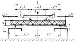 5.1. Геометрические размеры панелей проверяют универсальным измерительным инструментом. Внешний вид панелей контролируют по эталонам. 5.2. Предел огнестойкости панелей определяют испытанием образцов в соответствии с основными требованиями к производству испытаний строительных конструкций на огнестойкость по СНиП II-А.5-70. 5.3. Испытания панелей на прочность проводят по следующей методике. 5.3.1. Испытания панелей на прочность проводят на образцах длиной L, равной от 15 Н до 35 Н, где Н ¾ номинальная толщина панели. Ширина и толщина панели должны соответствовать указанным в табл. 1. 5.3.2. Испытаниям подвергают только те панели, которые удовлетворяют всем другим требованиям стандарта. 5.3.3. Для испытания панелей применяются следующие приборы и оборудование: установка для испытания панелей (черт. 3); нагрузочное устройство (пресс или рычажная установка); грузы штучные массой 10-20 кг. 5.3.4. Испытания проводят в помещениях с температурой воздуха 18 ± 2 °С и относительной влажностью 50-60 %. 5.3.5. Испытания образцов на поперечный изгиб проводят сосредоточенной нагрузкой по схеме, приведенной на черт. 3. Схема испытания образца на поперечный изгиб 1 - база; 2 - траверса; 3 - образец; 4 - цилиндрические металлические опоры диаметром 40-50 мм; 5 - деревянные прокладки сечением 100 ´ 25 мм. Черт. 3 Примечание. Допускается испытывать