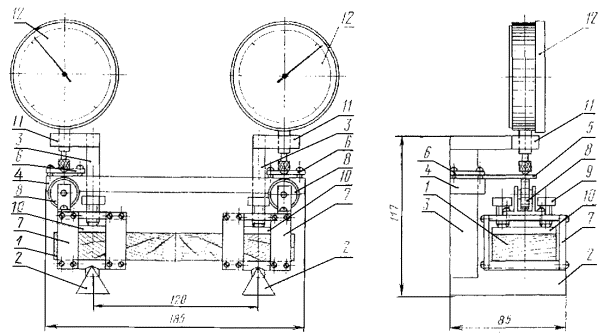 укрепленных на стойках 3, для установки индикаторов 12. 1.4. Все детали прибора