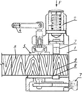1 - корпус; 2 - пуансон; 3 - нож пуансона; 4 - рукоятка; 5 - прижимная опора; 6 - передвижная опорная площадка; 7 - винт упора; 8 - образец; 9 - клеевое
