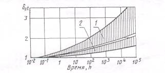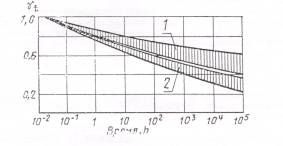 1 - для жестких термопластов; 2 - для термореактивных смол Черт. 6 Коэффициенты влияния среды по влажности при постоянном воздействии жидкой влаги для полиэфирных стеклопластиков с поверхностным защитным слоем