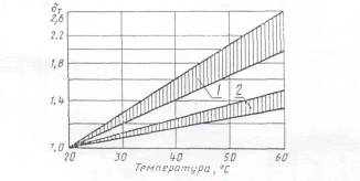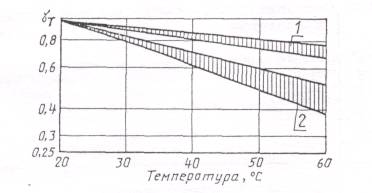 1 - для жестких термопластов и пенопластов; 2 - для полиэфирных стеклопластиков Черт. 5 Коэффициенты температуры при постоянно действующих повышенных температурах