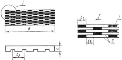 заполнителя должны соответствовать указанным на черт. 1 и 2. В сжатом состоянии В - ширина; S - толщина; l1 - ширина клеевых полос; l2 - расстояние между смежными клеевыми полосами; l3 - расстояние между прорезями; 1 - клеевой шов; 2 - листы бумаги Черт. 1 В растянутом