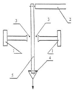 испытательной установки и груза. 1 - горелка; 2 - рама; 3 - термопара; 4 - устройство для подвешивания груза; 5 - образец Рисунок 7 - Схема установки для