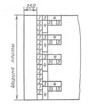 Черт. 1 1 – образцы для определения плотности и разбухания по толщине; 2 – образцы для определения водопоглощения лицевой поверхностью; 3 – образцы для определения влажности; 4 – образцы для определения предела прочности при изгибе; 5 – образцы для определения предела прочности при растяжении перпендикулярно к пласти Пункт