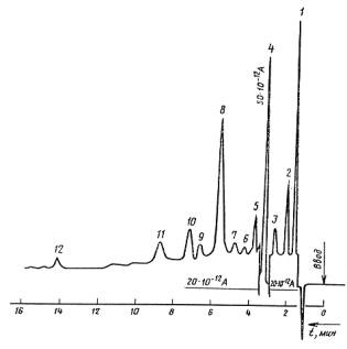 1 - гексен-1; 2 - четыреххлористый углерод; 3 - 2-этилгексен; 4 - хлороформ; 5 - бензол; 6, 7, 9, 10 - не идентифицированы; 8 - толуол; 11 - этилбензол; 12 - мезитилен. Черт.1 Хроматограмма пластификаторов, выделяющихся из поливинилхлоридных материалов