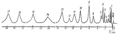 1 - винил хлористый; 2 - гексен-1; 3 - углерод четыреххлористый; 4 - метилен хлористый; 5 - хлороформ; 6 - трихлорэтилен; 7 - бензол; 8 - толуол; 9 - гексил хлористый; 10 - этилбензол; 11 - м-ксилол; 12 - о-ксилол; 13 - кумол; 14 - мезитилен; 15 - псевдокумол; 16 - анизол; 17 - циклогексанон. Черт.1 Типовая