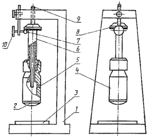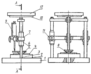 1 - основание; 2 - столик; 3 - шток; 4 - образец; 5 - опорная пластина; 6 - втулка, 7 -