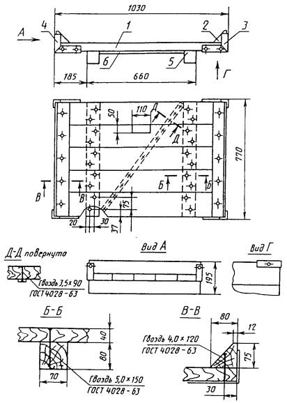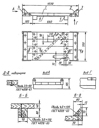 - настил; 2 - упор; 3 - уголок; 4 - уголок; 5 - опора; 6 - полоса Оковки к поддонам ПОД - 520ґ1030