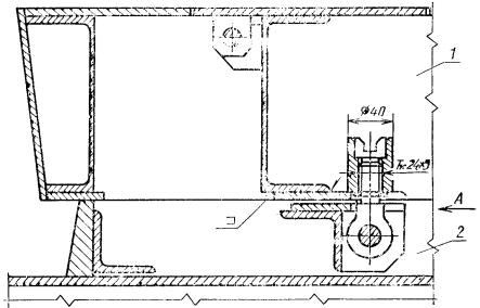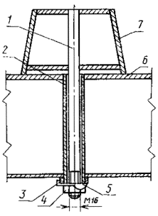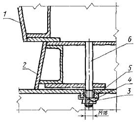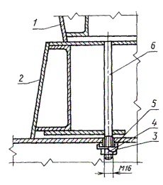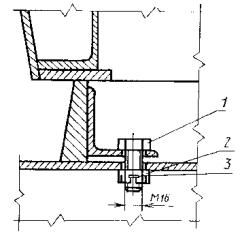 шпильках на поддоне с паровой полостью 1 - шпилька; 2 - направляющая; 3 - платик; 4 - гайка; 5 - отгибная шайба; 6 - поддон; 7 - вкладыш 2.3. Установка рамки разъемного проемообразователя на шпильках 1 - щит; 2 - рамка; 3 - отгибная шайба; 4 - гайка; 5 - платик; 6 - шпилька Черт. 16 1 - щит; 2 - рамка; 3 - отгибная шайба; 4 - гайка; 5 - платик; 6 - шпилька 2.4. Установка рамки разъемного проемообразователя на болтах 1 - болт; 2 - гайка; 3 - шплинт 2.5. Установка вкладыша на борту с креплением болтами 1 - болт; 2 - шайба отгибная; 3 - борт; 4 - вкладыш 2.6. Установка вкладыша на борту с креплением на шпильках 1 - шпилька; 2 - гайка; 3 - отгибная шайба; 4 - борт; 5 - вкладыш ПРИЛОЖЕНИЕ 4