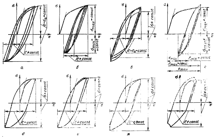 изменения нагрузок, деформаций и температуры в цикле, в том числе линейный (черт. 2, а-г, черт. 3, а-г), с выдержками и без