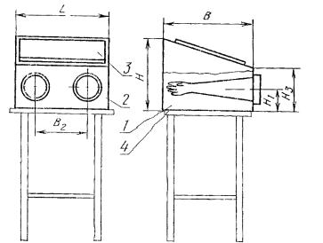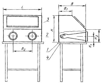 1 - корпус; 2 - перчатки; 3 - окно; 4 - столешница. Черт. 6 Защитный бокс