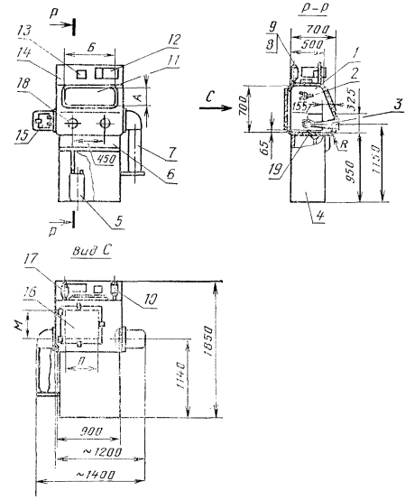 Защитный бокс 1БП1-нж 1 - корпус; 2 - душевик-распылитель; 3 - перчатки; 4 - подставка; 5 - сборник жидких отходов; 6 - вентильная панель; 7 - узел удаления твердых отходов; 8, 11 - окно по ГОСТ 23410; 9 - светильник; 10 - фильтр приточный; 12 - пульт управления; 13 - тягонапоромер; 14 - панель приборов; 15 - шлюз; 16 - монтажная дверь; 17 - фильтр вытяжной; 18 - обойма (d); 19 - 2 люка (К×Л). Черт. 8 Защитный бокс