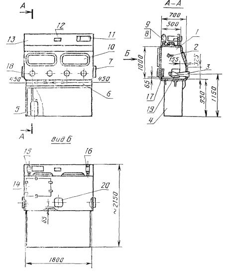 1 - корпус; 2 - душевик-распылитель; 3 - перчатки; 4 - подставка; 5 - сборник жидких отходов; 6 - вентильная панель; 7 - заглушка люка; 8, 10 - окно по ГОСТ 23410; 9 - светильник; 11 - пульт управления; 12 - тягонапоромер; 13 - панель приборов; 14 - монтажная дверь; 15 - фильтр вытяжной; 16 - фильтр приточный; 17 - дверка люка; 18 - обойма; 19 - 2 люка; 20 - люк для транспортера (К×Л) Черт. 9 Защитный бокс