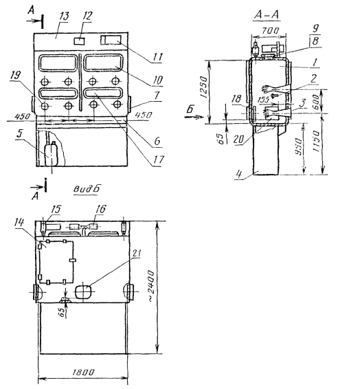 1 - корпус; 2 - душевик-распылитель; 3 - перчатки; 4 - подставка; 5 - сборник жидких отходов; 6 - вентильная панель; 7 - заглушка люка; 8, 10, 17 - окно по ГОСТ 23410; 9 - светильник; 11 - пульт управления; 12 - тягонапоромер; 13 - панель приборов; 14 - монтажная дверь; 15 - фильтр вытяжной; 16 - фильтр приточный; 18 - дверка люка; 19 - обойма; 20 - 2 люка; 21 - люк для транспортера Черт. 10 Защитный бокс