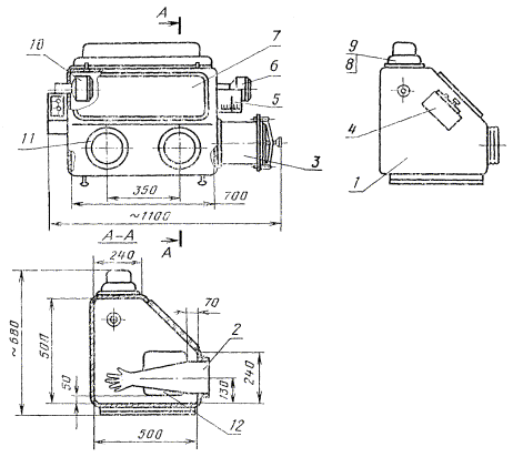 1 - корпус; 2 - перчатки; 3 - шлюз; 4 - пульт управления; 5 - тягонапоромер; 6 - фильтр приточный; 7, 9 - окно по ГОСТ 23410; 8 - светильник; 10 - фильтр вытяжной; 11 - обойма; 12 - люк (К×Л; D) Черт. 12 Защитный бокс