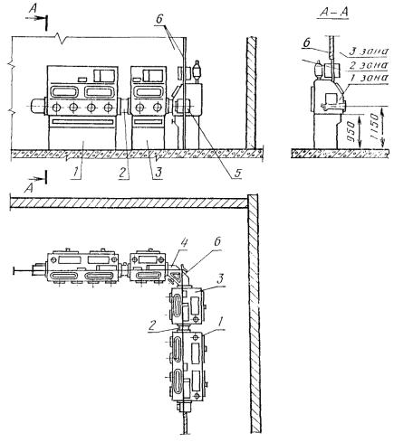 из защитных боксов без транспортера при трехзональной планировке помещения 1 - защитный бокс 1БП2; 2 - шлюз промежуточный; 3 - защитный бокс 1БП1; 4 - шлюз промежуточный угловой; 5 - шлюз; 6 - зональная перегородка Черт. 14 Пример условного обозначения радиационно-защитного бокса