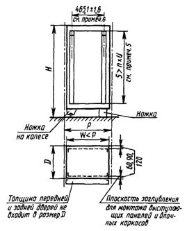 панелей серии Стандарт устанавливает обязательные требования. 2. ОПРЕДЕЛЕНИЯШкаф - независимо устанавливаемая, самоподдерживающая конструкция, предназначенная для размещения в ней электронного оборудования, которая может использоваться отдельно или в комбинации с другими шкафами, установленными в ряд. Шкаф может иметь или не иметь цоколь, ножки, ролики, ножки на колесах и т.д., в зависимости от нагруженности и мобильности. Шкаф может быть снабжен дверьми и (или) боковыми стенками с одной или нескольких сторон в соответствии с требованиями эксплуатации. Шкаф может иметь цельные и вмонтированные вертикальные элементы, позволяющие закреплять на них панели, соответствующие ГОСТ 28601.1. Стойка - металлическая конструкция без дверей или обшивки. 3. ШКАФОсновные размеры шкафа указаны на черт. 1 и в таблице.