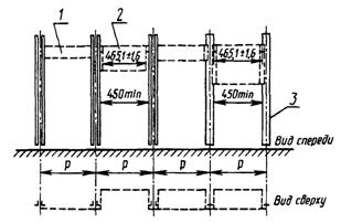 новых разработках. 4. ЗАКРЕПЛЕННЫЕ СТОЕЧНЫЕ КОНСТРУКЦИИЗакрепленная стоечная конструкция - ряд парных вертикальных элементов, расположенных с заданным шагом, прикрепленных к полу нижней частью и потолку и/или к стене верхней частью. Каждая пара вертикальных элементов позволяет установить на нее панели и т.д. в соответствии с ГОСТ 28601.1. Шаг закрепленных стоечных конструкций равен теоретическому расстоянию между центрами стоек. Каждый из вертикальных стоечных элементов может быть изготовлен как одно целое с соседним прилегающим к нему вертикальным стоечным элементом либо быть изготовлен отдельно при условии сохранения величины шага. Настоящий стандарт не устанавливает размеров таких конструкций по высоте и глубине. 5. ШАГИ ЗАКРЕПЛЕННЫХ СТОЕЧНЫХ КОНСТРУКЦИЙШаги закрепленных стоечных конструкций - это расстояния между условными осями, ограничивающими размещение стоек при установке их в ряд. Шаги закрепленных стоечных конструкций указаны на черт. 2.