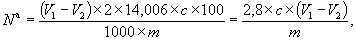кислоты (2.4.6), израсходованной на титрование при проведении определения, см3; V2 - объем раствора серной кислоты (2.4.6), израсходованной на титрование при проведении контрольного опыта, см3; 14,006 - относительная атомная масса азота; с - концентрация раствора