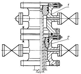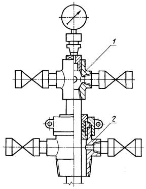1 - фланец-трубодержатель (74); 2 - уплотнительная крестовина (71) Двухрядная одноствольная трубная обвязка (40)