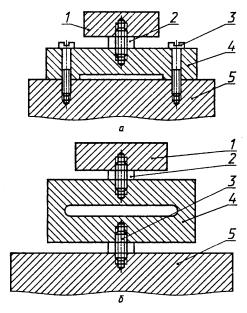 двух точках; б - крепление балки к столу стенда в одной точке 1 - приспособление для испытания