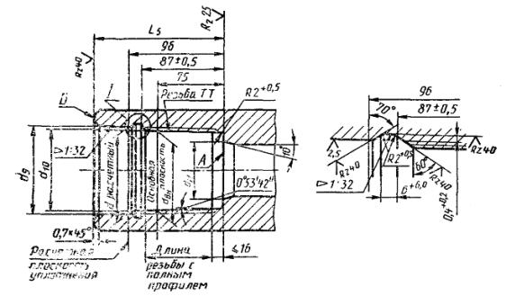 внутреннему диаметру внутренних резьб, а также конической расточки резьбы ТТ