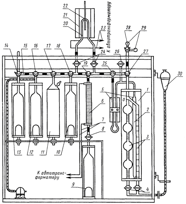 закрывают кран на пробоотборнике и снимают шланг с отростка крана 28. Поднимают склянку 30 и