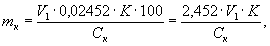 на титрование, см3; 0,02452 - количество серной кислоты, соответствующее 1 см3 точно 0,5 н. раствора гидроокиси