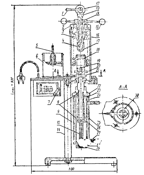 захвата сопровождается легким щелчком. Общий вид вискозиметра АКВ-2 1 - руководитель; 2 - стержень; 3 - пружина; 4 - втулка; 5 - ось; 6 - барабан; 7 - электродвигатель; 8 - прокладка; 9 - термостатирующая рубашка; 10 - капилляр; 11 - штатив; 12 - эксцентрик; 13 - винт; 14 - гайка; 15 - рукоять; 16 - стакан; 17 - цанга; 18 - пружина; 19 - штырь; 20 - опора; 21 - карандаш; 22 - гайка; 23 - прокладки; 24 - шток; 25 - измерительная камера; 26 - гайка накидная; 27 - штуцер; 28 - прокладка; 29 - гайка; 30 - винт Черт. 1 2.4. Перевернув рукоятку 1 на 180° опускают вниз эксцентрик 12,