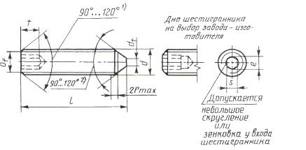 1) Угол 120° обязателен для коротких винтов, длина которых приведена над штриховой ступенчатой линией в таблице 1. 2) Угол 90° относится только к части конца ниже внутреннего