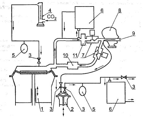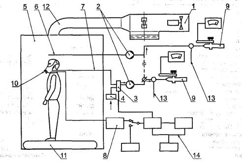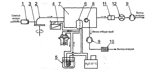 1 - воздушный фильтр; 2 - инжектор; 3 - стандартный образец пыли; 4 - распылитель; 5 - сатуратор; 6 - испытуемый образец; 7 - пылевая камера; 8 - зонд; 9 - насос; 10 - счетчик; 11 - фильтр; 12 - измеритель потока воздуха Рисунок 10 - Схема синусоидальной испытательной установки для определения устойчивости к запылению с использованием доломитовой пыли Дыхательную машину устанавливают на режим