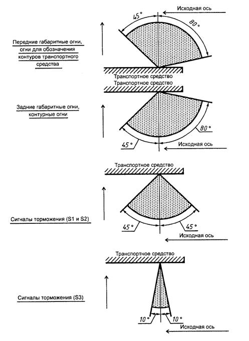 6.2 Вне исходной оси и в пределах полей видимости, определенных на схемах в приложении 1, сила света, испускаемого каждым из двух представленных образцов: 6.2.1 должна в каждом направлении, соответствующем точкам в таблице распределения света, приведенной в приложении 4, быть не меньше произведения минимального значения, указанного в 6.1, на процент, указанный в этой таблице для данного направления; 6.2.2 не должно ни в одном из направлений пространства, в пределах которого может быть видно устройство световой сигнализации, превышать максимальное значение, указанное в 6.1; 6.2.3 однако для габаритных (боковых) огней, совмещенных с сигналами торможения (см. 6.1.3) ниже плоскости, образующей с горизонтальной плоскостью направленный вниз угол в 5°, допускается сила света в 60 кд; 6.2.4 кроме того, 6.2.4.1 по всей площади полей видимости, определенных на схемах в приложении 1, сила испускаемого света должна быть не менее 0,05 кд для передних габаритных огней, задних габаритных (боковых) огней и контурных огней, не менее 0,3 кд - для сигналов торможения с одним уровнем силы света и для сигналов торможения с двумя уровнями силы света - 0,3 кд в дневное время и 0,7 кд в ночное время; 6.2.4.2 если задний габаритный (боковой) огонь совмещен с сигналом торможения, то соотношение между фактически измеренной силой света двух этих огней, включенных одновременно, и силой света заднего габаритного (бокового) огня, включенного отдельно, должно быть не менее 5:1 в поле, ограниченном прямыми горизонтальными линиями, проходящими через точки ± 5° V и прямыми вертикальными линиями, проходящими через точки ± 10° Н (таблица распределения света). Если сигнал торможения имеет два уровня силы света, то это положение должно соблюдаться в том случае, если он работает в ночном режиме; 6.2.4.3 предписания 2.2 приложения 4, касающиеся местных колебаний силы света, должны соблюдаться. 6.3 Сила света измеряется с помощью постоянно включенной лампы (ламп) накаливания, причем, когда речь идет об устройствах, испускающих селективный желтый или красный свет, - с помощью цветных ламп. 6.4 Для сигнала торможения с двумя уровнями силы света промежуток времени с момента включения электричества до того момента, когда сила света, измеренная в направлении исходной оси, достигает 90 % значения, измеряемого в соответствии с 6.3, измеряется как в дневных, так и в ночных условиях эксплуатации. Время, измеренное для ночных условий эксплуатации, не должно превышать времени, измеренного для дневных условий эксплуатации. 6.5 В приложении 4 приводятся указания в отношении методов измерения, которые следует применять. 7. Порядок проведения испытаний7.1 Все измерения должны производиться с помощью стандартной лампы накаливания белого цвета категории, предписанной для данного устройства, при напряжении питания, отрегулированном на излучении нормального светового потока, предписанного для этой категории ламп. 7.1.1 Все измерения на огнях с несъемными источниками света (лампами накаливания и др.) должны производиться при напряжении 6,75; 13,5 или 28,0 В соответственно. В случае источников света со специальным блоком питания вышеуказанное испытательное напряжение подается на входные клеммы этого блока питания. Испытательная лаборатория может потребовать от изготовителя предоставить этот специальный блок питания, необходимый для питан