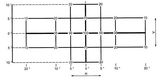 2.2 В пределах предусмотренного в пункте 2 поля распределения света, схематично представленного решеткой, структура светового потока должна быть в основном однородной, т.е. сила света в каждом направлении части поля, образуемой линиями решетки, должна соответствовать, по крайней мере, наиболее низкому минимальному значению, указанному в процентах на линиях решетки, окружающих данное направление.