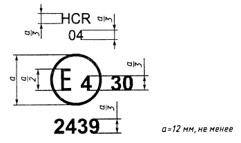 фары, то достаточно предусмотреть такое место на рассеивателе. 3.3 Фары, сконструированные таким образом, чтобы удовлетворять требованиям как правостороннего движения, так левостороннего движения, должны иметь надписи для обозначения обеих позиций крепления оптического элемента на транспортном средстве или лампы накаливания на рефлекторе; эти надписи должны состоять из букв R/D для позиции, соответствующей правостороннему движению, и букв L/G для позиции, соответствующей левостороннему движению. 4. Официальное утверждение4.1 Общие предписания 4.1.1 Если все образцы типа фары, представленные на основании раздела 2, удовлетворяют предписаниям настоящего стандарта, то данный тип фары считается официально утвержденным. 4.1.2 В том случае, если сгруппированные, комбинированные или совмещенные огни удовлетворяют требованиям более чем одних Правил, то может проставляться единый международный знак официального утверждения при условии, что каждый из этих сгруппированных, комбинированных или совмещенных огней отвечает применяемым к ним положениям. Настоящее требование не применяется к фарам, снабженным колбой с двумя нитями накала, в этом случае официальное утверждение предоставляется только в отношении одного луча. 4.1.3 Каждому официально утвержденному типу присваивается номер официального утверждения. Первые две его цифры (в настоящее время 04) указывают серию поправок, включаемых последние основные технические изменения, внесенные в стандарт на момент предоставления официального утверждения. Одна и та же Договаривающая сторона не может присвоить тот же номер другому типу фары, на которую распространяется настоящий стандарт, за исключением тех случаев, когда официальное утверждение распространяется на устройство, отличающееся от официально утвержденного только по цвету излучаемого света. 4.1.4 Стороны Соглашения 1958 года уведомляются об официальном утверждении, распространении официального утверждения, об отказе в официальном утверждении, отмене официального утверждения или окончательном прекращении производства типа фары на основании настоящих Правил посредством карточки, соответствующей образцу, приведенному в приложении 1, с указаниями, предусмотренными в 2.2.1.1. (Поправка серия 04). 4.1.4.1 если фара оснащена регулируемым отражателем и предназначена для установки только в положениях, указанных в 2.2.1.1, то по получении официального утверждения податель заявки обязан надлежащим образом информировать потребителя о правильном положении (положениях) установки фары. (Поправка серии 04). 4.1.5 На каждой фаре, соответствующей типу, официально утвержденному на основании настоящих Правил, в местах, указанных в 3.2, помимо маркировки, предписанной в 3.1, проставляется знак официального утверждения, описание которого содержится в 4.2 и 4.3. 4.2 Схема знака официального утверждения Знак официального утверждения состоит: 4.2.1 из международного знака официального утверждения, представляющего собой: 4.2.1.1 круг, в котором проставлена буква Е, за которой следует отличительный номер страны, предоставивший официальное утверждение 1); 4.2.1.2 номер официального утверждения, предусмотренный в 4.1.3; 1) 1 - Германия, 2 - Франция, 3 - Италия, 4 -