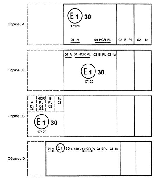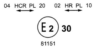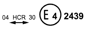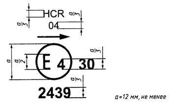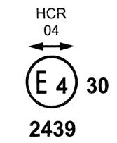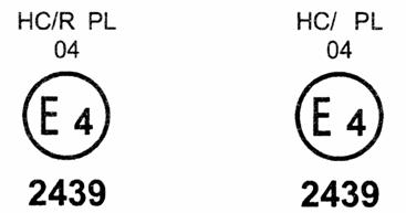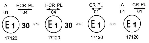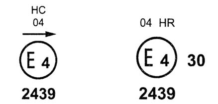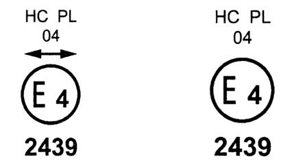 Договаривающимися сторонам Соглашения. 4.2.2 из следующего дополнительного обозначения или обозначений: 4.2.2.1 на фарах, отвечающих требованиям только левостороннего движения, - горизонтальной стрелки, направленной острием вправо по отношению к наблюдателю, смотрящему на фару спереди, т.е. в ту сторону дороги, по которой происходит движение; 4.2.2.2 на фарах, которые предназначены для установки - посредством соответствующей регулировки оптического элемента или лампы накаливания - для обоих направлений движения, - горизонтальной стрелки, имеющей два острия, одно из которых соответственно направлено влево, а другое - вправо; 4.2.2.3 на фарах, удовлетворяющих требованиям настоящих Правил только в отношении ближнего света, - буквы НС; 4.2.2.4 на фарах, удовлетворяющих требованиям настоящих Правил только в отношении дальнего света, - буквы HR; 4.2.2.5 на фарах, удовлетворяющих требованиям настоящих Правил как в отношении ближнего света, так и в отношении дальнего света, - буквы HCR; 4.2.2.6 на фарах с рассеивателями из пластических материалов рядом с обозначениями, предписанными в 4.2.2.3-4.2.2.5, проставляется сочетание букв PL; 4.2.2.7 на фарах, удовлетворяющих требованиям настоящих Правил в отношении дальнего света, рядом с кругом, в котором проставлена буква Е, наносится обозначение максимальной силы света, выраженной при помощи маркировочного значения, указанного в 6.3.2.1.2. В случае совмещенных фар указание максимальной силы света лучей дальнего света в целом производится способом, аналогичным приведенному выше. 4.2.3 В каждом случае соответствующий способ использования, применяемый в ходе испытания в соответствии с 1.1.1.1 приложения 5, и допустимое напряжение в соответствии с 1.1.1.2 приложения 5 должны быть указаны в карточке официального утверждения и в карточке сообщения, направляемым странам, которые являются Договаривающимися сторонами Соглашения и которые применяют настоящие Правила. В соответствующих случаях на устройствах проставляется следующая маркировка: 4.2.3.1 на фарах, удовлетворяющих требованиям настоящих Правил, которые сконструированы таким образом, чтобы нить накала ближнего света не включалась одновременно с какой-либо другой нитью, с которой она может быть совмещена, проставляется на знаке официального утверждения после обозначения лампы ближнего света наклонная черта (/); 4.2.3.2 на фарах, удовлетворяющих требованиям приложения 5 и работающих только от напряжения 6 или 12 В, около держателя лампы накаливания проставляется число 24, перечеркнутое косым крестом. 4.2.4 Около вышеупомянутых дополнительных обозначений могут наноситься две цифры номера официального утверждения (в настоящее время 04), которые указывают на серию поправок, включающих последние основные технические изменения, внесенные в Правила на момент предоставления официального утверждения, и, в случае необходимости, соответствующая стрелка. 4.2.5 Знаки и обозначения, упомянутые в 4.2.1 и 4.2.2, должны быть четкими и нестираемыми, даже если фара установлена на транспортном средстве. 4.3 Схема знака официального утверждения 4.3.1 Отдельные фары Примеры схем знаков официального утверждения с вышеупомянутыми дополнительными обозначениями приведены в приложении 3 на рисунках 1 - 9. 4.3.2 Сгруппированные, комбинированные или совмещенные лампы 4.3.2.1 Если сгруппированные, комбинированные или со