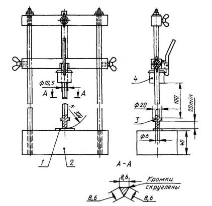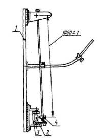 1 - образец; 2 - плита из стали массой (10±1) кг; 3 - промежуточная стальная деталь массой 100 г; 4 - скользящий груз массой (100±2) г