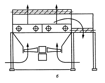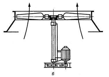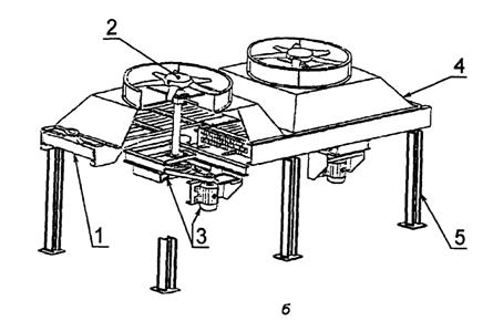 находятся во ВНИИКИ и ВНИИНМАШ Госстандарта России. 3. Классификация, основные параметры и размеры3.1 Аппарат воздушного охлаждения (далее - аппарат) представляет собой теплообменный аппарат, состоящий из следующих основных частей: теплообменной поверхности (теплообменная секция); системы подачи воздуха, включающей вентилятор с приводом от электродвигателя, диффузор с коллектором; опорной металлоконструкции. Типичная конструкция аппарата приведена на рисунке 1. 3.1.1. По способу принудительной подачи охлаждающего воздуха на теплообменную поверхность аппараты подразделяют на два вида: - нагнетательный (рисунок 1а); - вытяжной (рисунок 1б). 3.1.2. По расположению теплообменных секций в пространстве аппараты подразделяют на горизонтальные, вертикальные, зигзагообразные и дельтаобразные. 3.1.3. По условиям эксплуатации аппараты могут быть снабжены дополнительными устройствами, обеспечивающими рециркуляцию нагретого в теплообменных секциях воздуха, для предотвращения переохлаждения продукта в зимнее время. По этому признаку аппараты подразделяют следующим образом: а) без рециркуляции (см. рисунок 1);