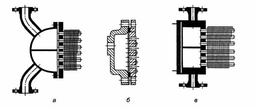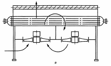 б - с внешней рециркуляцией Рисунок 2 - Аппараты воздушного охлаждения б) с внутренней рециркуляцией через соседний вентилятор (рисунок 2а); в) с внешним коробом для рециркуляции (рисунок 2б). Типичная конструкция теплообменной секции приведена на рисунке 3. 3.2. В зависимости от конструкции камер теплообменных секций аппараты могут быть: а) с разъемными камерами на давление до 6,3 МПа; б) с цельносварными камерами с пробками на давление до 10 МПа; в) с трубчатыми камерами на давление свыше 10 МПа. Основные типы камер приведены на рисунке 4. 3.3. Дополнительно аппараты могут быть оснащены: а) увлажнителем воздуха, необходимым для снятия пиковых нагрузок в летнее время; б) подогревателем воздуха, устанавливаемым перед теплообменной секцией в потоке воздуха; в) подогревателем продукта типа «труба в трубе», конструктивно объединенным с трубным пучком теплообменной секции;