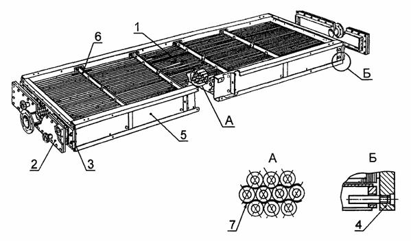 1 - трубный пучок; 2 - крышка камеры; 3 и 4 - неподвижная и подвижная трубные доски; 5 - боковая стенка; 6 - балка; 7 - дистанционирующий