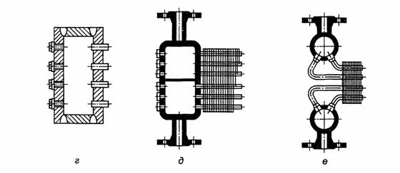 а, б, в - разъемные камеры на давление до ,3 МПа; г, д - цельносварные камеры с пробками на давление до 10,0 МПа; е - трубчатые камеры на давление свыше 10,0 МПа Рисунок 4 - Основные типы камер теплообменных секций 4. Общие технические требования4.1. Характеристики аппаратов воздушного охлаждения 4.1.1. Показатели назначения аппаратов должны соответствовать приведенным в нормативной и конструкторской документации на аппараты конкретных типов. 4.1.2. Характеристики аппаратов, обеспечивающие при изготовлении соответствие аппаратов показателям назначения, приведены в таблице 1. Указанные в таблице 1 характеристики должны подтверждаться при проведении приемочных, периодических и сертификационных испытаний аппаратов.