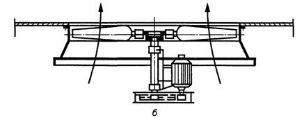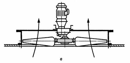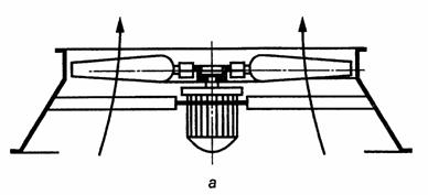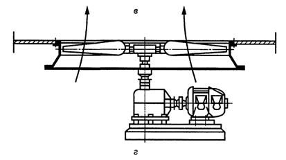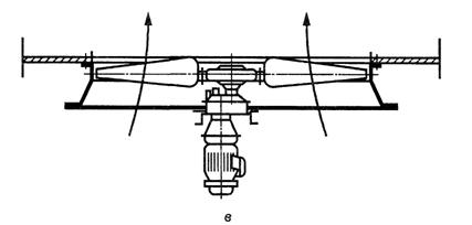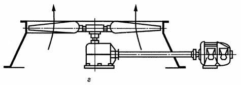 редуктор с перпендикулярными валами Рисунок 6 - Приводы аппаратов вытяжного вида4.2.7. Требования к электродвигателям 4.2.7.1. Электродвигатели, служащие приводами вентиляторов, должны быть многофазными асинхронного типа. 4.2.7.2. Класс точности балансировки привода 3 - по ГОСТ 22061 (оговаривается при заказе электродвигателя). 4.2.7.3. Исполнение двигателя и его техническая характеристика должны соответствовать условиям работы аппарата. 4.2.7.4. Установочная мощность электродвигателя должна превышать мощность, потребляемую вентилятором, не менее чем на 10 %. 4.2.7.5. В аппаратах с рециркуляцией воздуха электродвигатели должны быть рассчитаны на работу при температурах окружающей среды с учетом рециркуляционных потоков воздуха. 4.2.8. Требования к передаче 4.2.8.1. В раме приводов вентиляторов должны быть предусмотрены резьбовые отверстия для регулировочных болтов. 4.2.8.2. Смазка и масло в передаче должны быть приняты в соответствии с ГОСТ 26191. 4.2.8.3. Открытые движущиеся части передачи должны иметь ограждения. 4.2.9. Требования к жалюзи 4.2.9.1. Конструкция системы тяг жалюзийной решетки должна обеспечивать синхронность перемещения лопаток жалюзи. Зазор между соседними лопатками при закрытых жалюзи для аппаратов с рециркуляцией воздуха не должен превышать 3 мм. 4.2.9.2. Зазор между лопатками жалюзи (у их концов) и боковыми стенками не должен превышать 6 мм. 4.2.9.3. Конструкция лопаток и каркаса жалюзи должна быть жесткой и исключать перекос прилегающих кромок лопаток. 4.2.9.4. При использовании привода его мощность должна не менее чем в два раза превышать необходимую мощность, которая требуется для перемещения жалюзийных заслонок. 4.2.9.5. Пневмопривод по требованию заказчика может быть оснащен позиционером. 4.2.9.6. Жалюзийная решетка, оснащенная приводом, должна быть снабжена концевыми указателями положения жалюзи с подачей сигнала на пульт управления. 4.2.9.7. При ручной регулировке работы жалюзи должно быть предусмотрено стопорное устройство. 4.2.9.8. Жалюзийные решетки при ручном регулировании поворотом лопаток по требованию заказчика могут быть оснащены удлинителями для осуществления ручного регулирования с земли или с площадки. 4.2.9.9. Материал подшипниковых втулок для опоры осей жалюзийных лопаток должен выдерживать максимальную температуру продукта при входе в аппарат. 4.2.10. Конструктивные требования к аппарату в целом 4.2.10.1. Качество и характеристики покупных комплектующих изделий должны соответствовать действующей нормативной документации на их изготовление и поставку. 4.2.10.2. Климатическое исполнение комплектующих изделий должно соответствовать климатическому исполнению аппарата. 4.2.10.3. Предельные отклонения размеров на необрабатываемые поверхности и сварные конструкции, не указанные в конструкторской документации, не должны превышать соответствующих очень грубому классу точности, отклонения размеров между обрабатываемыми и необрабатываемыми поверхностями - грубому классу точности, на обрабатываемые поверхности - среднему классу точности по ГОСТ 25670. Предельные отклонения присоединительных размеров аппаратов, не указанные в конструкторской документации, должны соответствовать среднему классу точности по ГОСТ 25670. 4.2.10.4. При присоединении листов обшивки на диффузорах, коллекторах вентиляторов, жалюзи и других малонагруженных элементах аппар